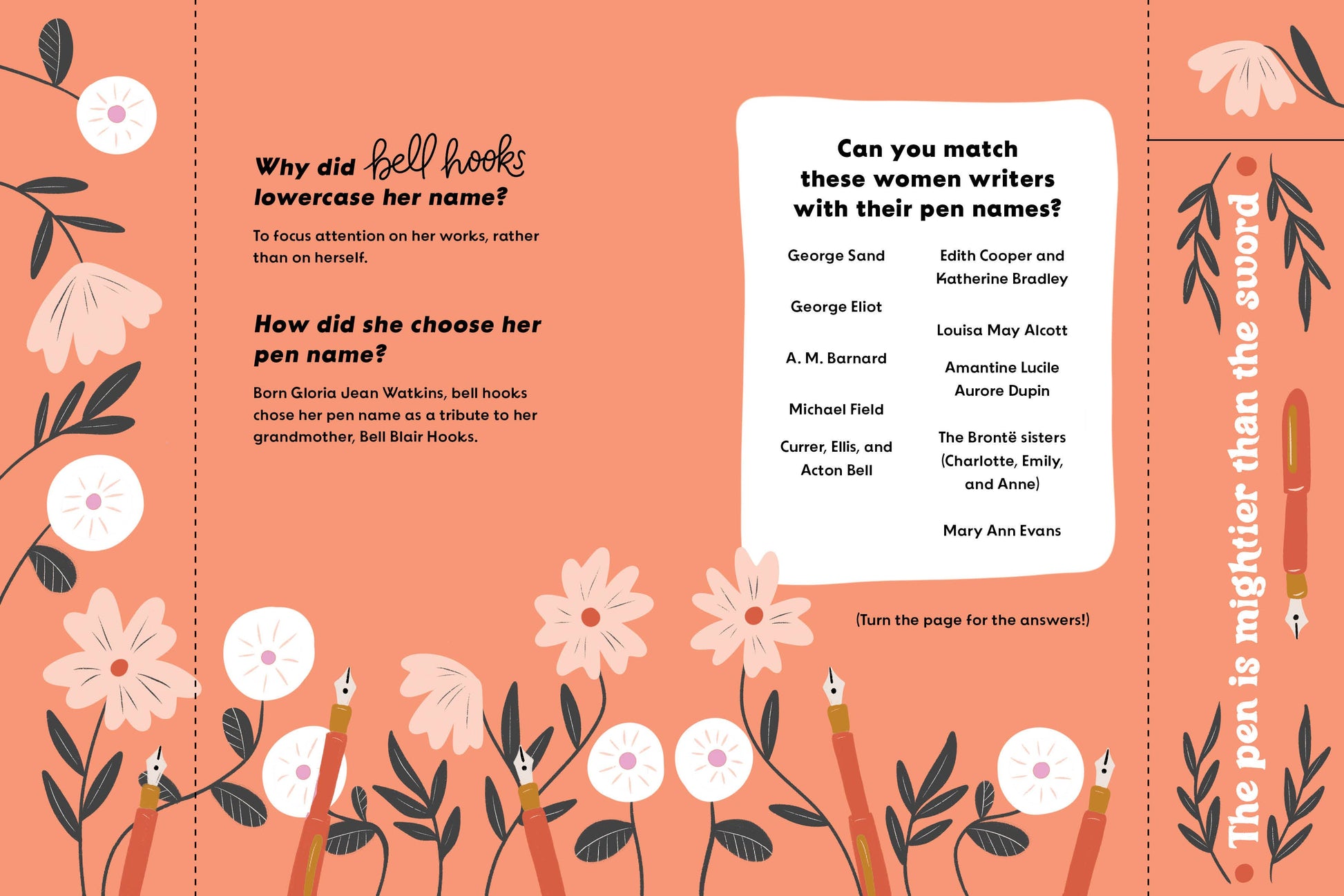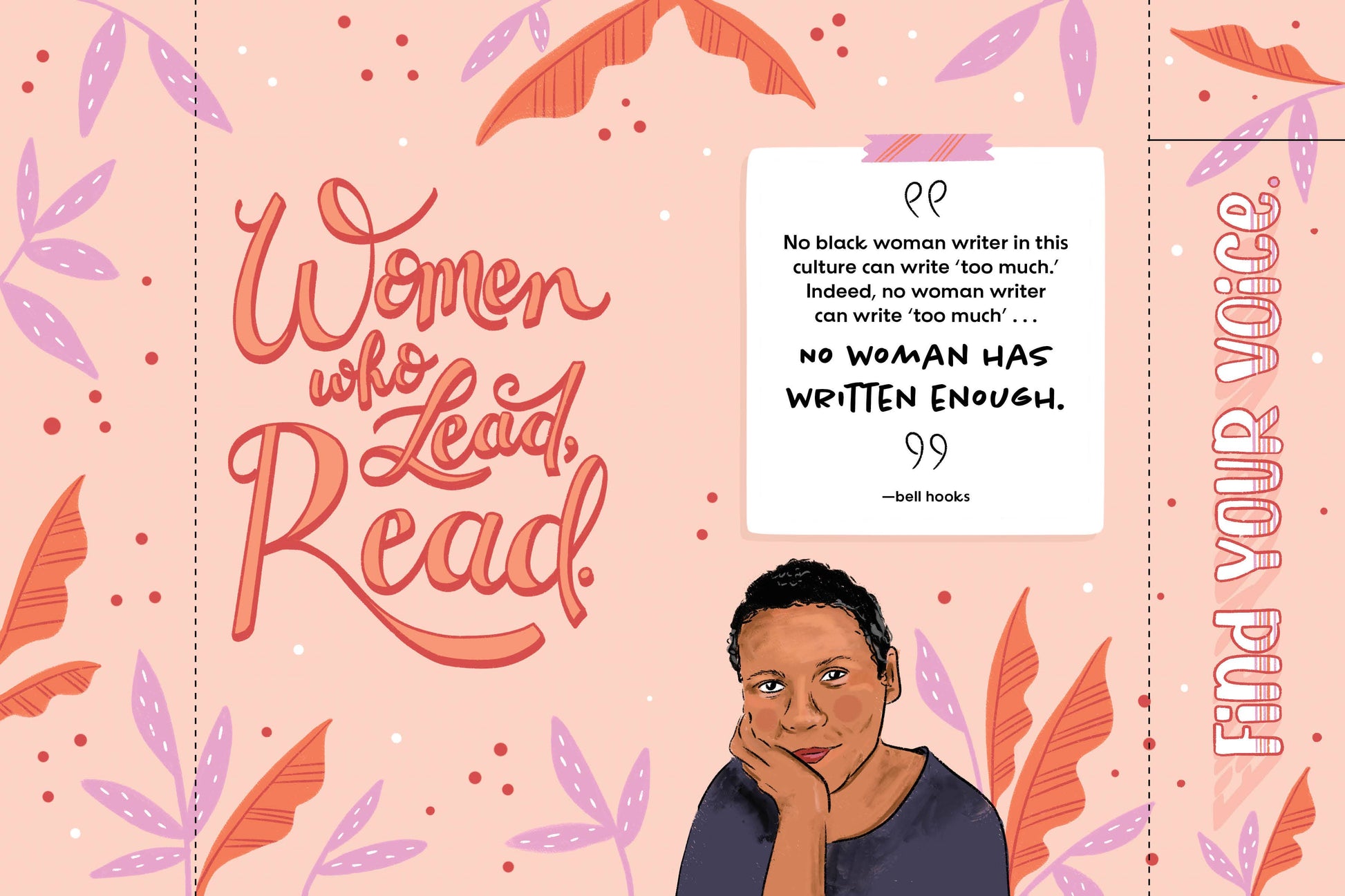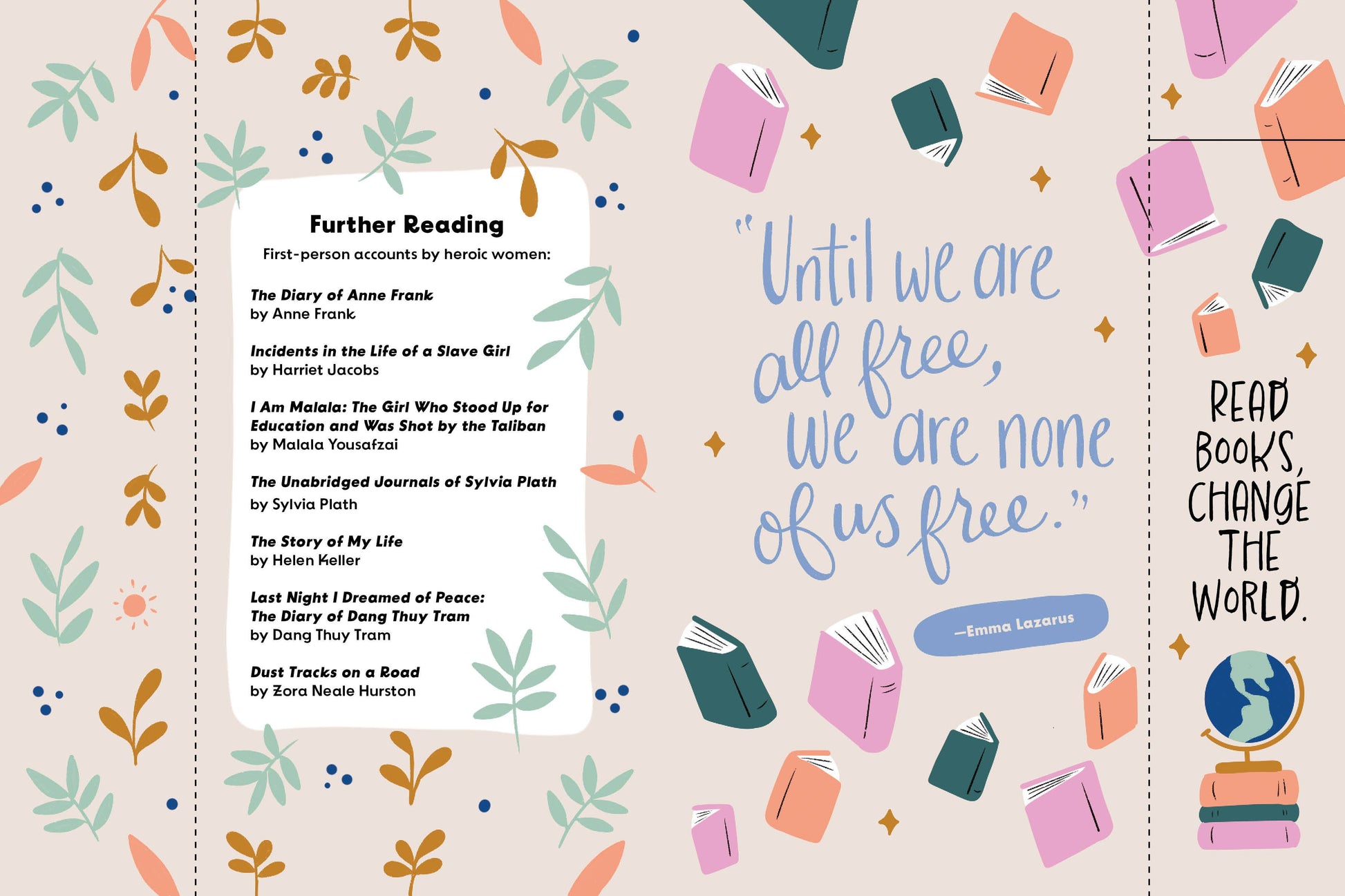 Quotes, bios, fun facts, and illustrations of bold, visionary female writers fill each page. An Audre Lorde quote—“When I dare to be powerful, to use my strength in the service of my vision, then it becomes less and less important whether I am afraid”—sits on a spread with a bookmark that reminds readers to READ FEARLESSLY.