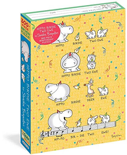Hippo Birdie Two Ewe is a terrific puzzle version of the famous, beloved Boynton birthday card—in print since 1975, with over 10 million copies sold (so far!). This festive and funny puzzle makes a perfect birthday present for a friend of any age. And it's also perfect for starting a birthday tradition in your own family: On every birthday, out comes this 300-piece puzzle! Together, everyone busily assembles the design, and when at last the puzzle is nearly complete, the lucky birthday person gets to put in the final piece. The moment the puzzle is finished, we all heartily sing: "HIPPO BIRDIE TWO EWE! HIPPO BIRDIE TWO EWE!" (etc).