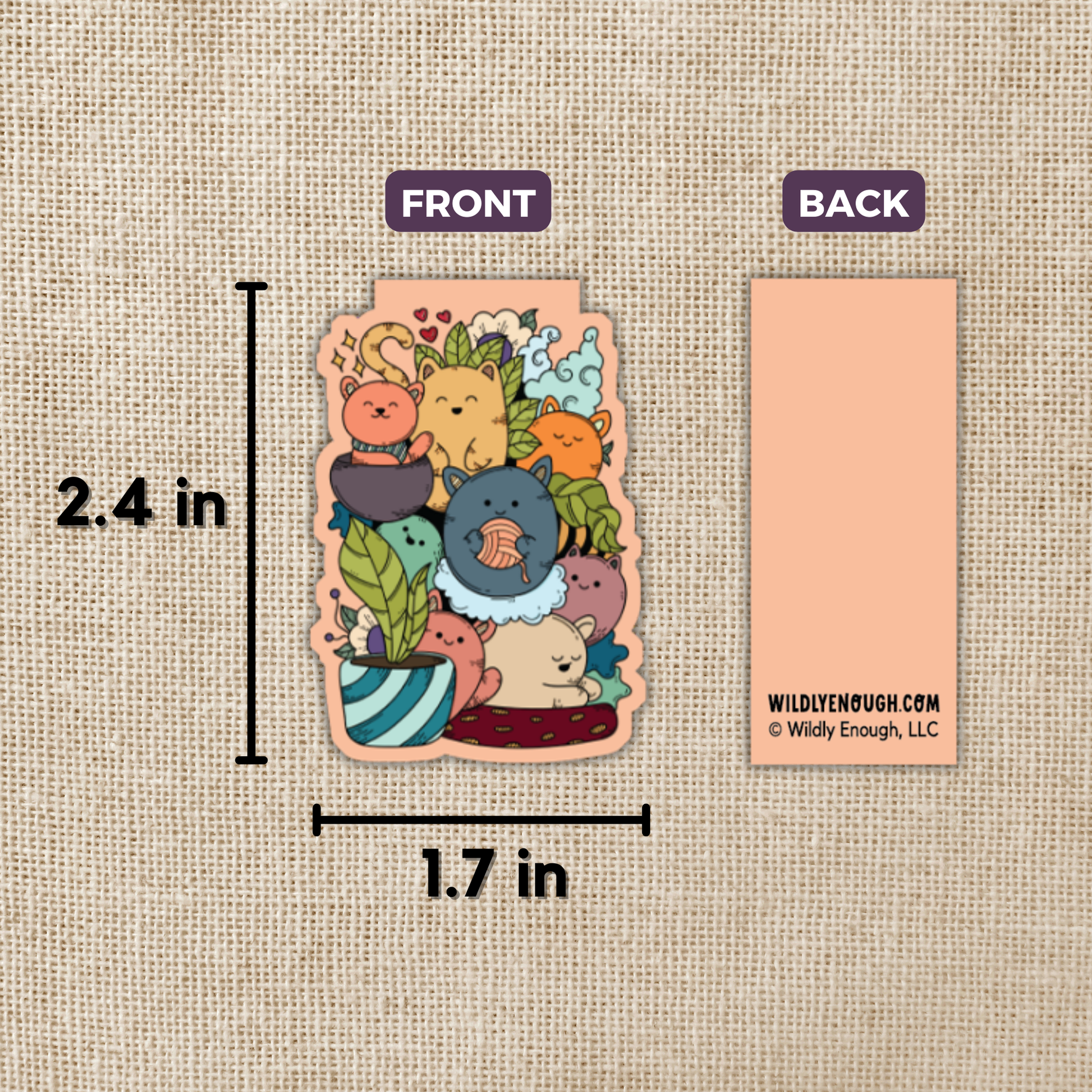 A group of happy, silly cats with yarn and plants! This jewel tone magnetic bookmark is perfect for every cat lover. *Bookmark Details* - 2.4x1.7 inch sticker - Full interior of the bookmark is magnetic - Heavyweight glossy cardstock with magnetic backing.